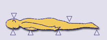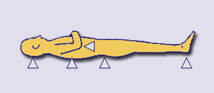 خوابیده به شکم: قفسه سینه، پاتلا، ناحیه دورسال پدیس (روی پا)، پیشانی