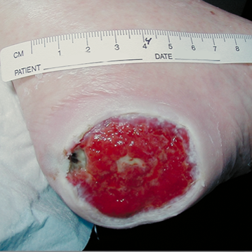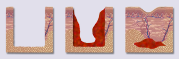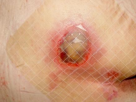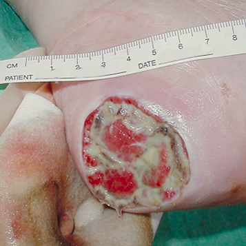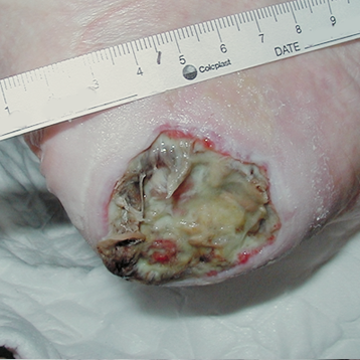 قسمت های مختلف زخم در فازهای مختلف ترمیم قرار دارند و زخم شامل بافتهایی با رنگ سیاه، زرد و قرمز به طور همزمان است.